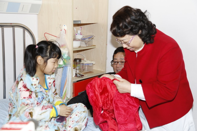 过年穿新衣是是春节的传统习俗,很多住院患儿家长没有心情也没有时间去给孩子购置新衣。党员志愿者们来到血液科和肿瘤外科,为患儿们送上崭新的羽绒马甲,戴上温暖的围巾。七十多位住院的血液肿瘤患儿新年穿上了新衣,在感受节日气氛的同时也收到医护人员满满的祝福和关怀。