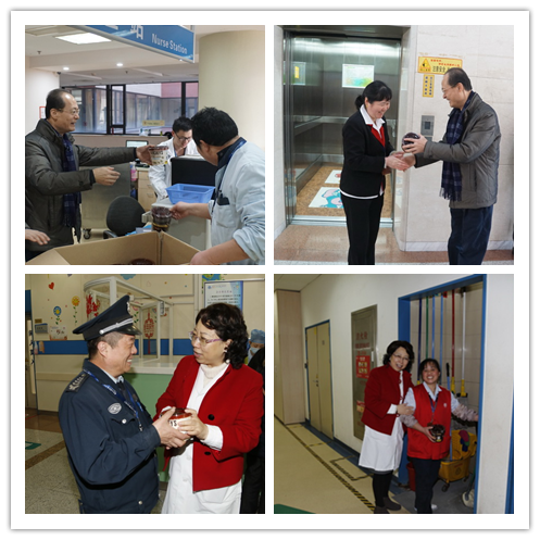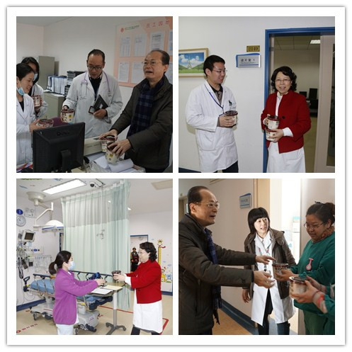 在医院门诊、急诊诊室、病房、后勤保障等部门,黄国英院长和徐虹书记一一亲临临床第一线,为大年初一坚守岗位的医务工作者送上巧克力和满满的祝福。