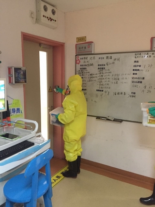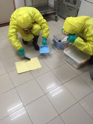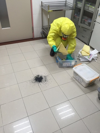 下午16:02分,操作护士在取一瓶乙醇时不慎打破,瓶内液体流出。随即,该护士报告护士长,同时拨打消控中心电话,消控中心通知安保部化学品应急人员,保安人员迅速感到现场,维护现场秩序,并做好现场隔离警戒。保安人员及护士长穿戴好防护用口后,进入治疗室对泄漏物进行围堵、吸收和处理。病区医生护士全程现场观摩。