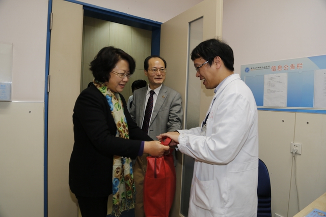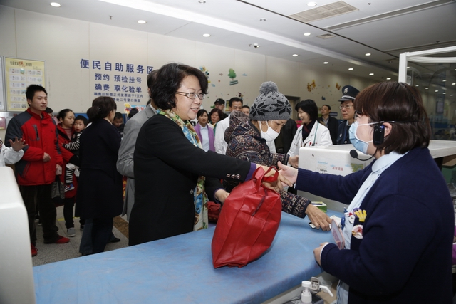 2015年12月31日上午,上海市副市长翁铁慧与上海市卫生计生委党政领导及上海市医务工会领导一行来到儿科医院,亲切看望和慰问奋斗在“战高峰”一线的医务人员,并对他们的辛勤付出表示感谢。翁铁慧副市长等一行走访了急诊预检、输液中心和急诊抢救室并慰问当班医护人员,亲切询问工作情况,并祝大家新年快乐,身体健康。