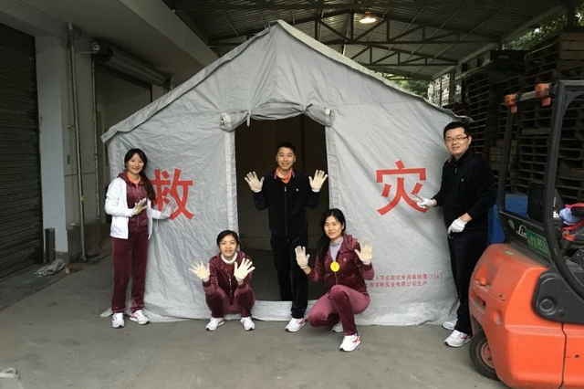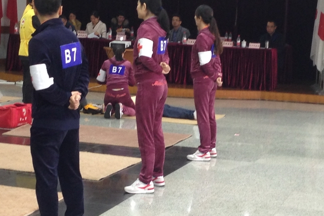 当拿到比赛项目表单时,大家顿时变得紧张起来,这次比赛除了传统的包扎救护,还增加了帐篷搭建撤除、负重跑等野外救护项目,对于我们这支临时组建的救援队伍来说难度相当大。但队员们面对困难丝毫不退缩,12平方米*2米多高的救灾帐篷,在第一天的练习时间里反复搭撤,钢筋敲在了队员的手臂上,螺帽夹破了手指,队员们只简单了处理了一下伤就继续投入到练习中。在教练指导下,第一次的搭建撤除花费了近25 分钟,在随后的练习中大家不断摸索技巧,有野外徒步经验的沈建青为大家明确了分工,安放部件,拼装支架,覆盖蓬帐,渐渐将时间缩短到18分钟。在正式比赛中,队员们更是表现出了一支优秀团队的精神,无比默契,最终以15分钟完成了整个帐篷搭建撤除比赛。第二项负重行进跑比赛尽管队伍里有三位女生,但是队员们都体现出了一支专业救护队的高素质,20公斤的背包背在肩上,在队友的相互鼓励下,队员们大步向前,不负众望,以出色成绩战胜了中山医院、瑞金医院等其他12家红十字医院获得此项目第一。在急救技能项目比赛中,我院更是一支独秀,五位队员体现了极高的专业救护能力。心血管中心的金芸以流畅完美的动作率先完成了CPR/AED操作比赛,接着4位队员同时进行了不同部位受伤的包扎固定比赛,在整个过程中大家动作专业迅速,又对伤员加入了人文关怀,所有队员均在规定时间内完成了全部比赛项目,当队长报告比赛完成时,全场响起了一片赞叹。