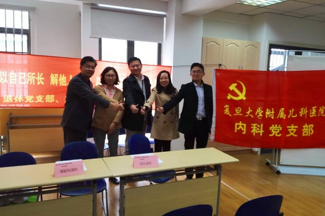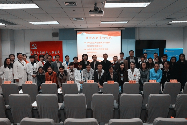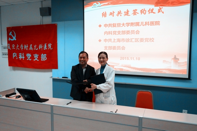 11月10日晚上,在儿科医院行政楼第一教室举行了本次党日活动的重头戏:儿科医院内科党支部与徐汇区区委党校支部的结对共建活动。徐汇区委党校副校长,党支部书记宋敬业率党支部成员来到儿科医院。儿科医院党委书记徐虹,党办主任张晓波,院办主任翟晓文及内科党支部,退休党支部,规培党支部党员四十余人参加了结对仪式。活动由内科党支部委员徐家骅主任主持,内科党支部黄瑛书记向来宾介绍了内科党支部的基本情况,以及我们开展的快乐医生加油站特色党建活动内容和意义。儿科医院党委书记徐虹在致辞中肯定了内科党支部在儿科医院党建工作中的纽带作用。她认为内科党支部内引退休支部继承老一辈儿科精神,结对规培支部新生力量,外联徐汇区党校丰富了党建活动的形式也扩大了辐射面,是党建活动的创新。徐书记指出按照复旦大学党委“三严三实”学习教育的部署,开展多种形式的主题党日活动可以增进党员的党性修养,增强支部的凝聚力和战斗力。徐汇区委党校副校长,党支部书记宋敬业也发表了热情洋溢的讲话,他希望双方支部结对共建切实加强合作,使双方党建工作取得共赢。在签订结对共建协议仪式后,由徐汇区委党校的张旭东和张太星老师分别作了“当前中国周边安全与对外战略”和“践行三严三实,加强党性修养”的讲座。从时事政治的热点和当前党员教育的要求两方面为儿科党员上了生动的一课。