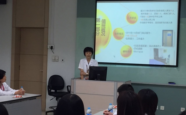 2015年9月8日下午,院办牵头举行全院行政总值班培训,来自各个科室的行政总值班人员50余人参加此次培训,特邀医院原党委书记曹莲华老师开展讲座。