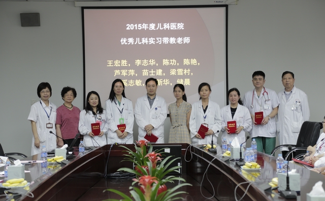 儿科学系每年都会公正、公平、公开的根据实习同学对临床带教老师的评分评选出儿科医院优秀带教老师。今年,共评选出10名优秀带教老师:王宏胜、李志华、陈功、陈艳、芦军萍、苗士建、梁雪村、奚志敏、王新华和储晨。他们在繁忙的临床工作同时还承担了带教任务,并赢得了广大实习同学的好评。