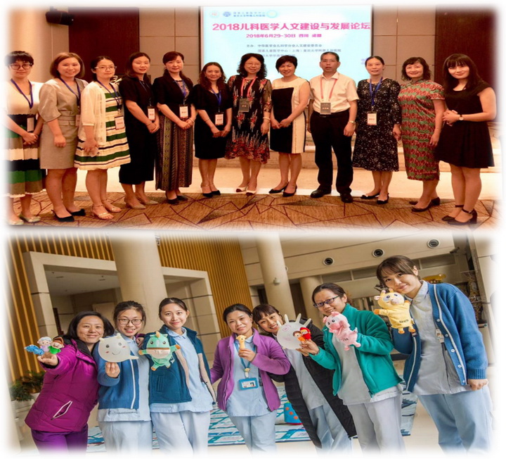 这支队伍不断地充实自我、完善自我、突破自我,2018年6月抽血中心护士长田俊华、神经外科骨干护士王佳怡前往成都参加“人文建设与发展论坛”,8月份急诊资深护士张顺娣、消毒供应中心资深护士庄燕华参加杭州浙江大学医学院附属儿童医院举办“以家庭为中心的儿科医疗照护”学习班,交流儿童医疗游戏的实践经验,提高自身技能,也与同行交流经验,以促进儿童医疗游戏向更高水平发展。在12月份举办的第五届全国儿童专科医院医务社会工作实践与研究高级研修班(儿童医疗游戏辅导的实践专题)上,她们通过主题发言、路演展示、游戏工作坊等多种形式,与来自全国各地40多家医疗机构的医护人员、社工以及公益组织交流分享她们在临床开展医疗游戏辅导的实践经验,极大地推动了儿童医疗游戏领域的发展,扩大我院影响力。